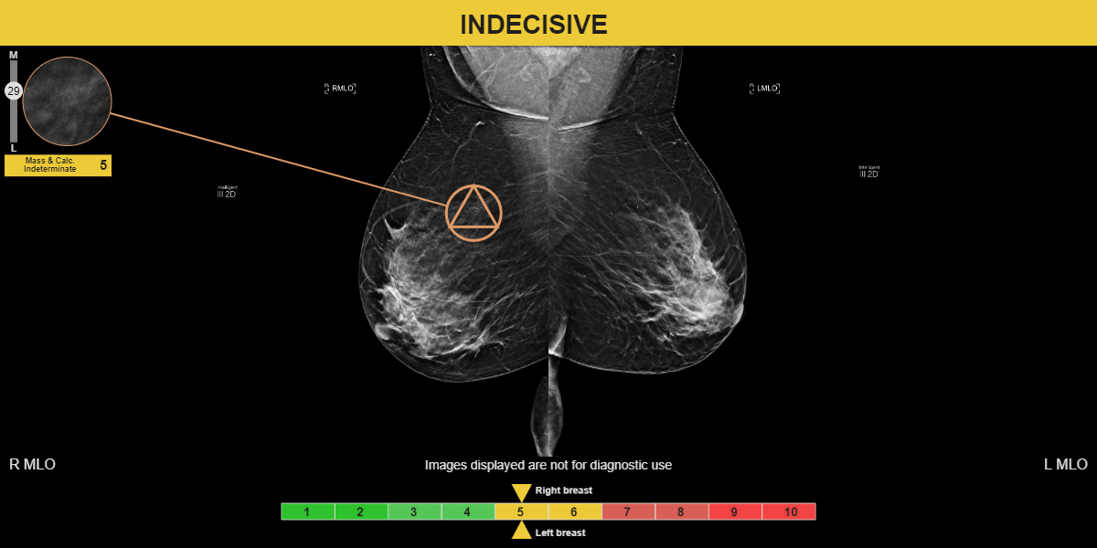 Thanks to the yellow score, MammoScreen can draw attention to subtle lesions that can in some cases be malignant.