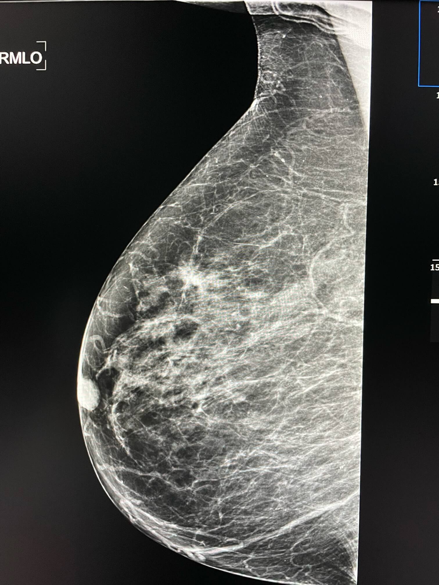 A first mammogram in December 2020 showed an increase in opacity pointed out by Mammoscreen in the right breast, a first radiologist performed an ultrasound without any suspicious abnormality.