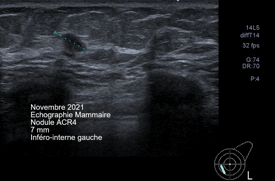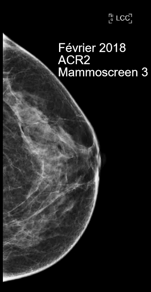 In February 2018, an ACR2-rated screening exam was performed, the MammoScreen Score™ was of 3, with no specific suspicions on the left.